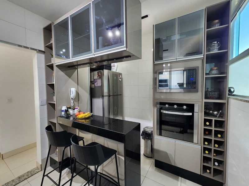 Cozinha montada com eletrodomésticos embutidos — geladeira, fogão, forno, micro-ondas e coifa